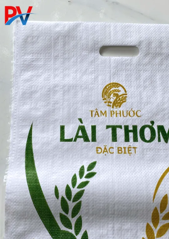Bao PP dệt đựng gạo lài thơm có thể đục quai xách chắc chắn, giúp người mua dễ dàng mang theo, nhất là các loại bao gạo 5kg – 10kg. Quai xách được gia công gọn, chịu lực tốt, hạn chế rách bao khi sử dụng thực tế, góp phần nâng cao trải nghiệm người dùng và tăng thiện cảm với thương hiệu gạo.